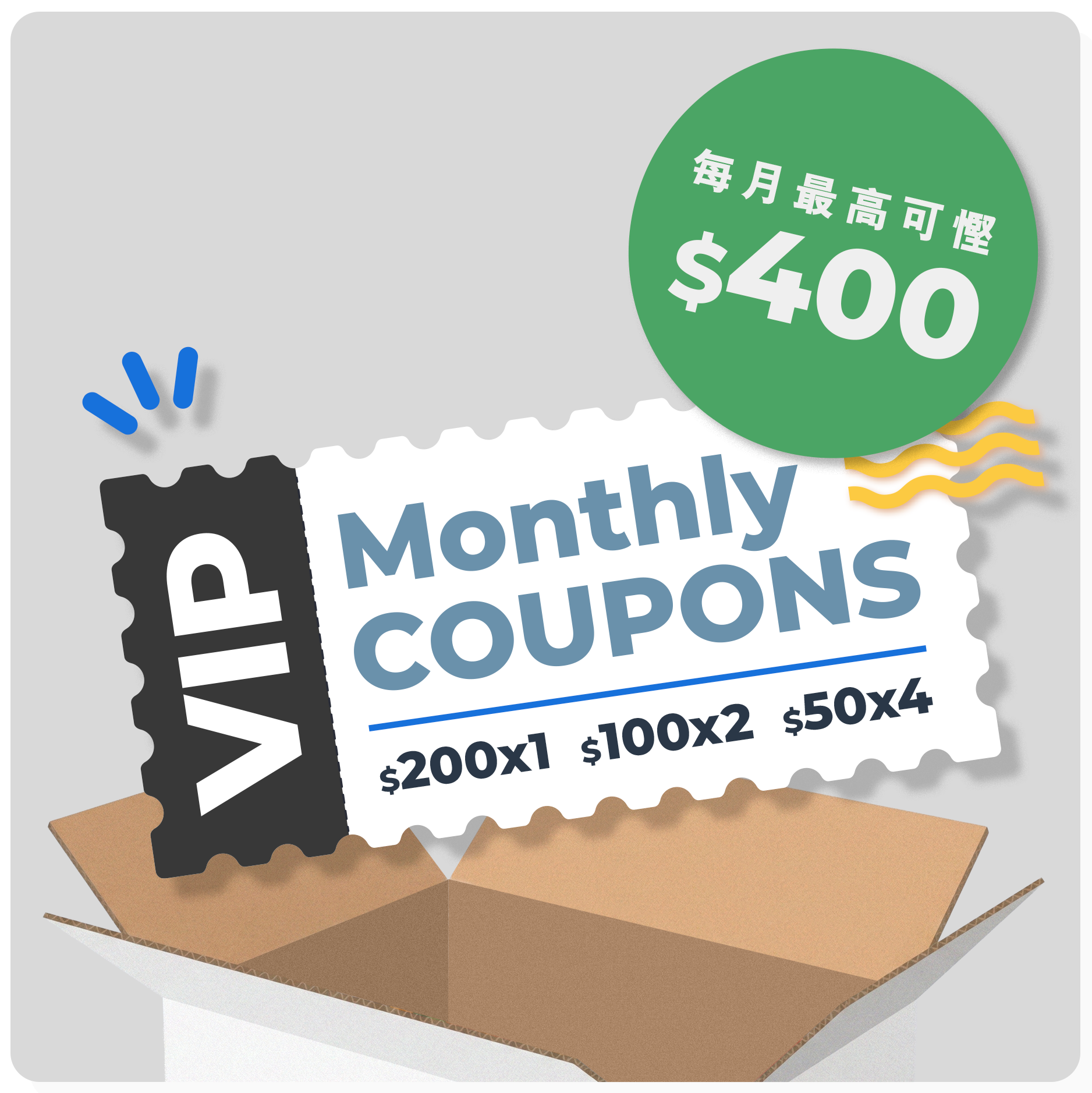 1. Monthly Coupons up to $400: Receive a total of 7 coupons ($50x4, $100x2, $200x1). Use one per order (每月高達 $400 優惠券: 內含 $50x4、$100x2 及 $200x1 優惠券(每次下單只限使用一張)).